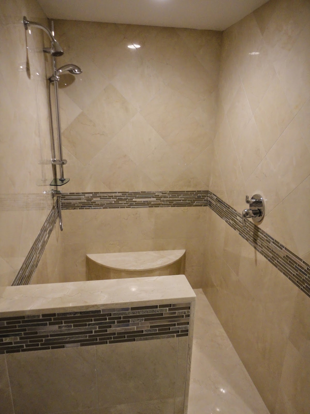 Sarasota Tile contractor installed this Crema Marfil marble in Sarasota on Longboat key. The marble shower is a 12X12 tile installed straight on the bottom half and diagonally on the top half. The shower has a glass/slate mosaic band that runs through the shower and around outside the shower knee wall and across the tub backsplash. This also connect to the counter top backsplash. The seat in the shower is solid concrete and wrapped in marble. The shower floor was installed diagonally and has a ebbe shower drain. A custom built shampoo shelf was built into the knee wall and all of the grout and marble was sealed with aqua mix sealers choice gold..