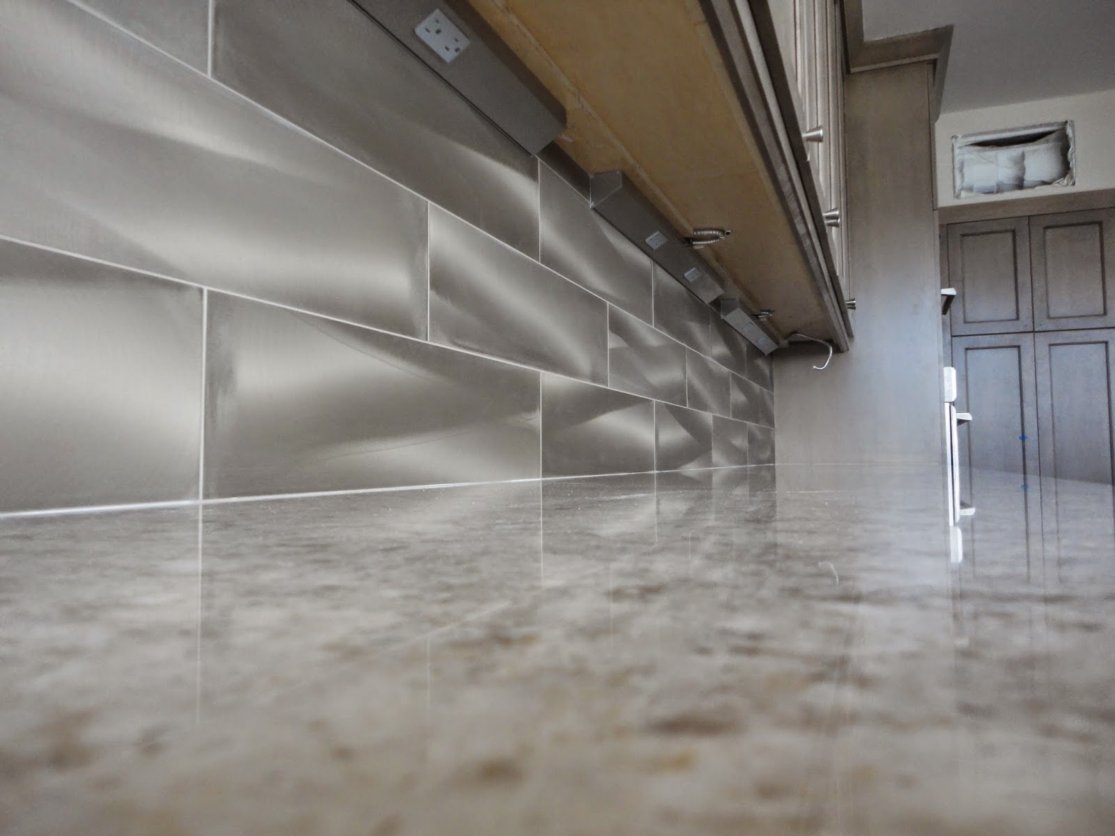 Metaluxe tile install on a kitchen backsplash. These tile have a metal coating on them with a brushed swirl finish. The tiles can be cut on a normal tile wet saw with care. In this installation the kitchen wall had a slight deflection in it so to achieve a perfectly flat surface the tiles were installed using the mud set method. The tiles are 6"X24" and are rectified, this means the tiles have been cut down on all four side to make the tiles dimensionally more accurate. With the tiles being rectified we are capable of installing them closer together because of the tiles tighter tolerances. When installing tile closer together without a cushioned edge there is no room for any variation of the substrate, therefore the only way to achieve a lippage free tile installation is to mudset it. With the metal finish on the tiles, the manufacture only recommends using a unsanded grout to eliminate scratching the surface with a sanded grout. Before having a tile contractor install these tile make sure to check their qualifications and references because a mistake could become very costly due to the tiles costing approximately $80.00 each material only.